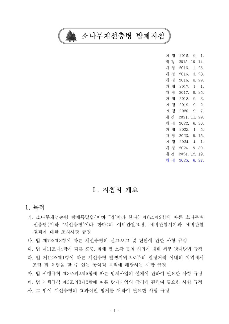산림청에서 게시된 소나무재선충병 방제지침이 일부 개정 되어 공유드립니다.자세한 내용은 게재된 첨부파일 및 링크 참고 부탁드립니다. http://www.forest.go.kr/kfsweb/cop/bbs/selectBoardArticle.do?bbsId=BBSMSTR_1069&mn=NKFS_06_09_01&nttId=3210333