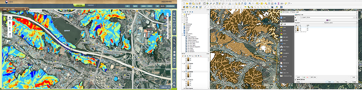 | 토석류 | 피해이력, 직접영향권내 보호시설, 유역면적, 계류평균경사도, 토심, 붕괴, 침식, 전석, 토석류흔적, 산사태위험등급 현황, 산림현황, 뿌리특성, 기타위험요소, 토석류시뮬레이션평가 |